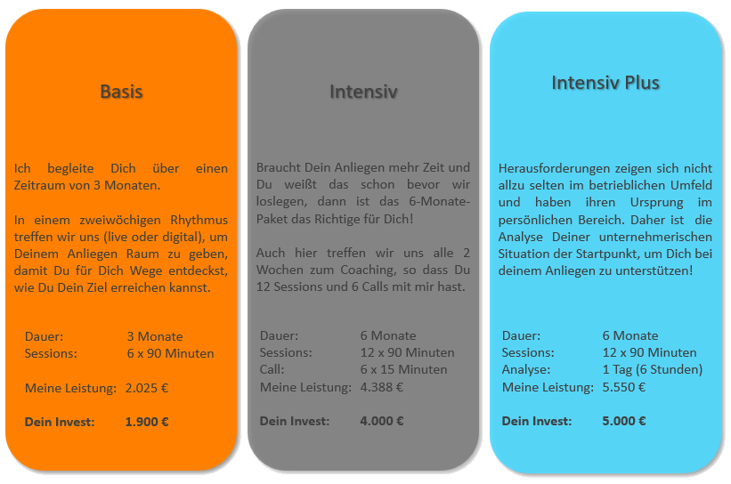 Sofern ich 1:1 coache, dauert das Coaching pro Sitzung 90 Minuten. Das ist eine Dauer, die sich in meiner Praxis bewährt hat. Erfahrungsgemäß braucht es eine gewisse Zeit, um den Dingen auf die Spur zu kommen. Für jeden Baustein meines Portfolios biete ich die folgenden Pakete je nach Bedarf an: